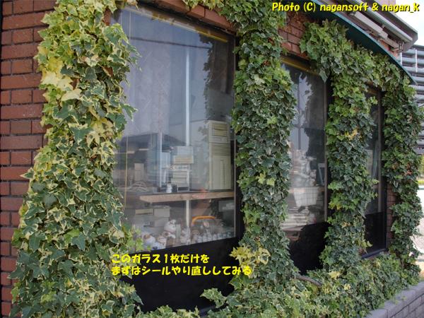 去年の台風で発覚した事務所の基礎から水が室内へ侵入です。これは、その基礎のすぐ上位置に大きい嵌め殺しショーうウインドウがありまして、それのガラスシールにクラックが盛大に入っていて水が浸入なんです。