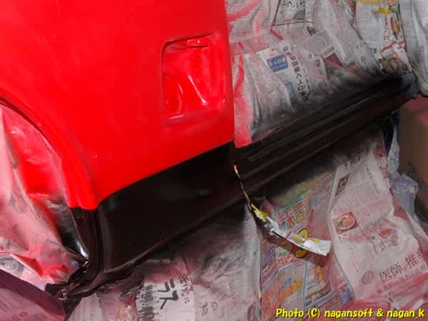 まずは前回にサイドシル外装へ黒色塗装したときのマスキングを剥がします。