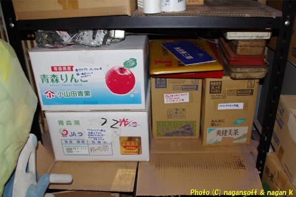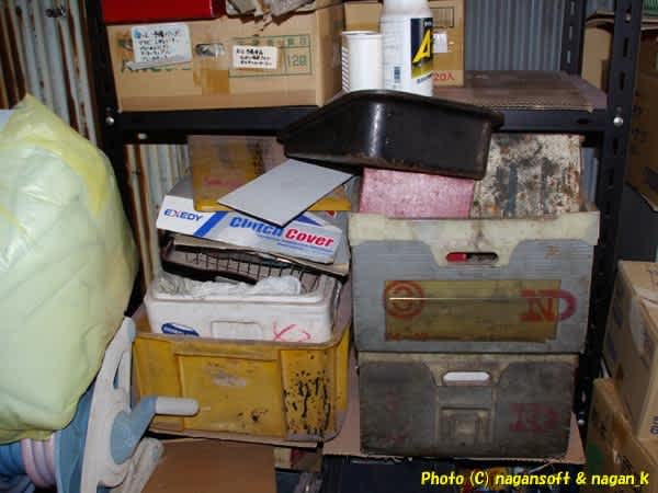 ガレージ奥のスチールラックにむちゃくちゃに詰め込んでいる汚い箱です。