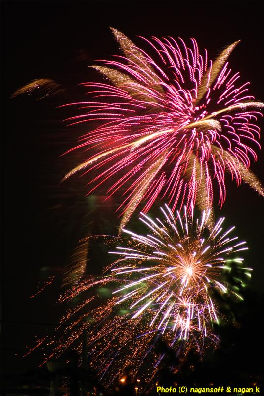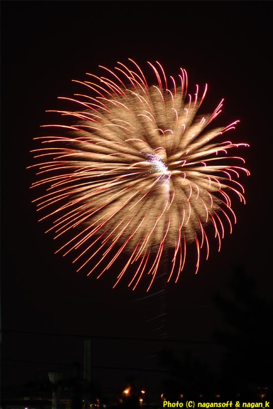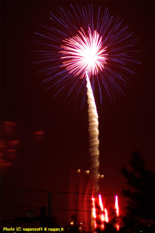 そして爆発しても、特大サイズは画角の上端にちょろっと写りこむだけでした。いままでの普通サイズの花火は被写体ど真ん中に入ります。