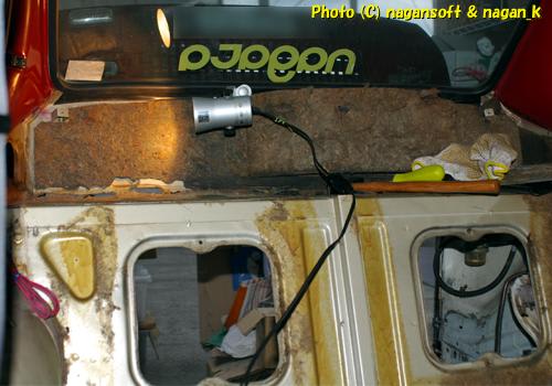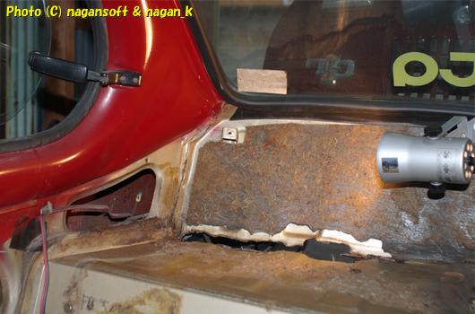 アスファルトシート状物質を剥いだので、エンジンルーム天井角大穴部分が解放されて室内と繋がりました。