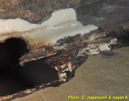 サビ穴から見えている黒いボード状のものをつついてみると、なんか「ねっちょり感」のある物体です。なんというのかなー、ビルの屋上に敷き詰めているアスファルトシートのような感触のものです。