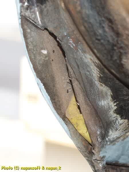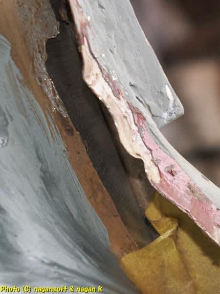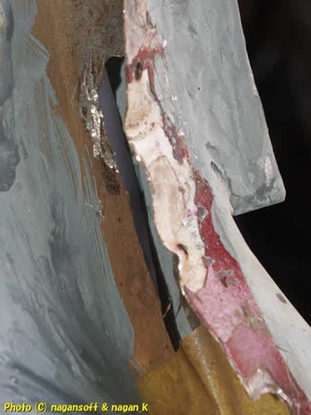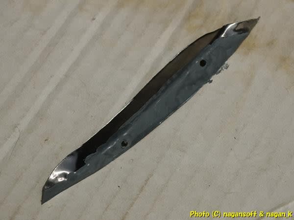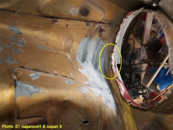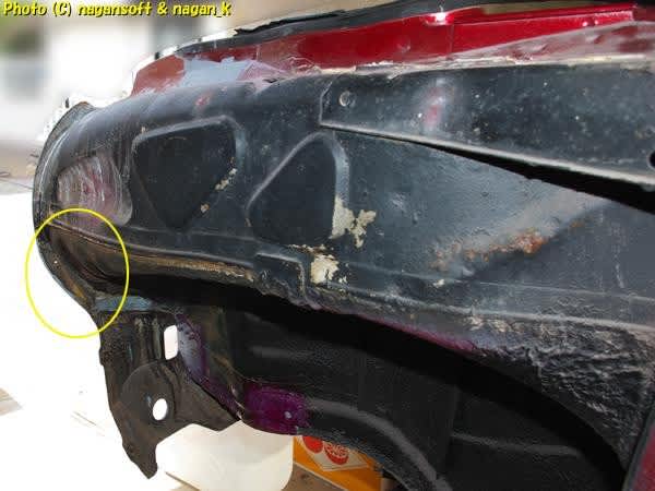 フェンダーエプロンとフロントパネル合わせ部の錆クズを1年4ヶ月前に切除した部分。