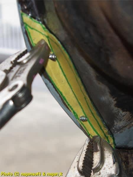 切り出した鉄板を適当にペンチで曲げてホドホドの形にしてから車体にあてがってハンマーでコンコンと成形。