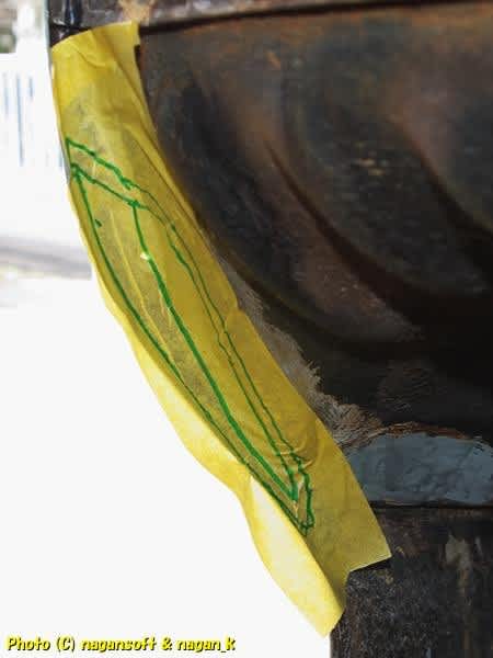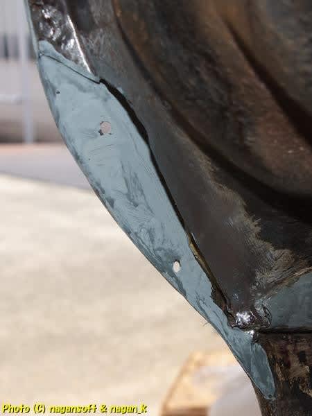 このパッチピースなんですが、フェンダーエプロン側はハンダ板金にて密着溶着、フロントパネル側はリベット止めにて隙間にシール材充填と考えてます。