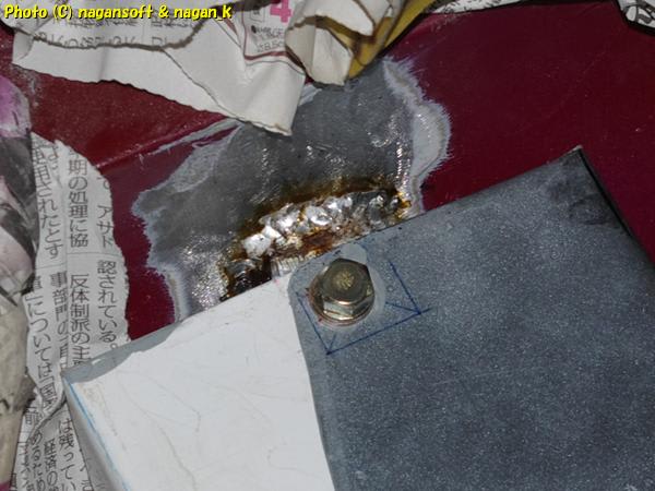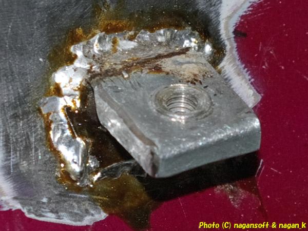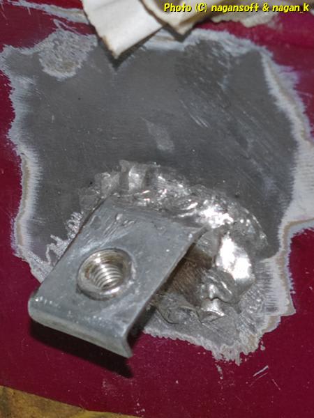 ツメ折箇所+ブラインドナット取付強化の目的でハンダ鏝を持ち出して炙ります。