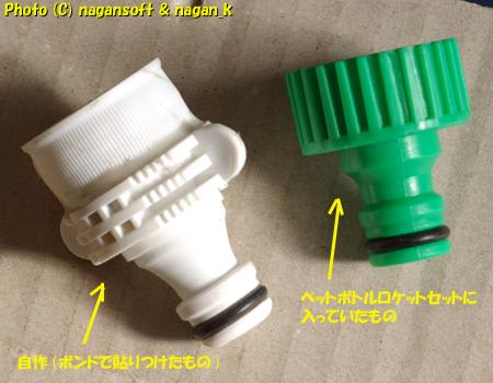 まずは自宅にて、自作ペットボトルノズル(ボンドしたもの)と、既製品(ペットボトルロケットキットに付属の噴射口)の確認。