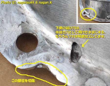 さらに水が溜まるのか、虫食い錆び穴が開いていた箇所があったので、その部分は穴を広げて成形し、あえて水抜き穴にしました。