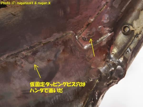 オーバーハングしている箇所へ貼り付けることになるのでハンダ板金中にピース固定できません。ついてはタッピングビスにて仮固定する作戦です。