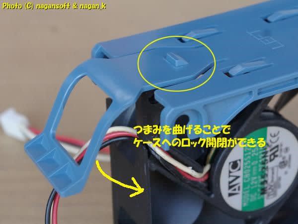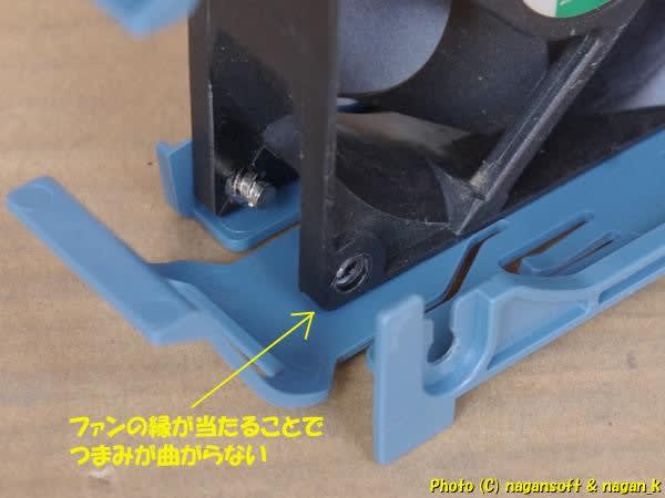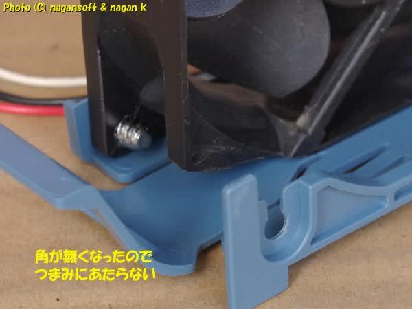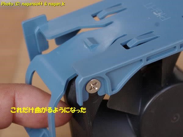 オリジナルは厚みのあるファンだったので、ファン胴体筒部分の逃げの上につまみが来て、つまみを曲げることができるのです。