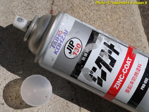 ジンクスプレーに、別のスプレー缶の噴射口をセットして、細いノズルを穴の中に差し込んで、内部に吹き付けるという方法です。