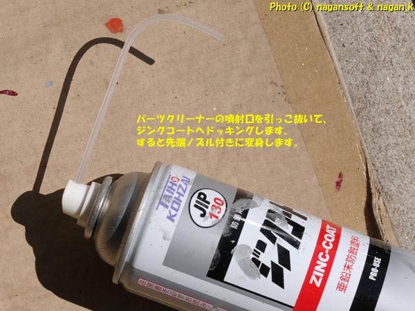 袋部分でサビ穴や、ネジ穴があろうものなら、そこに差し込んで袋内部にジンクスプレーをいれちゃうというものです。