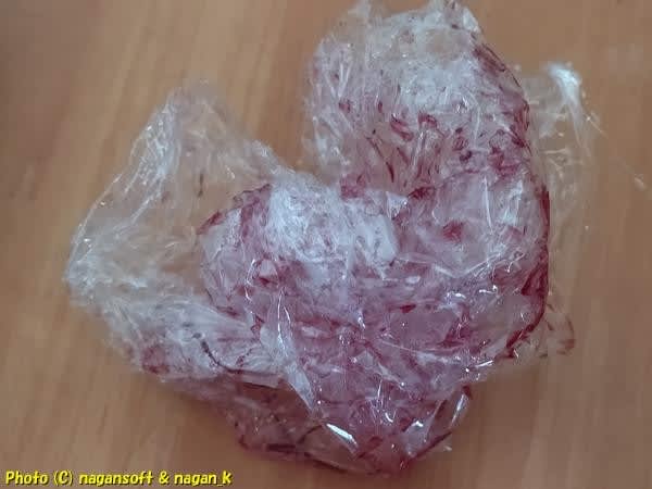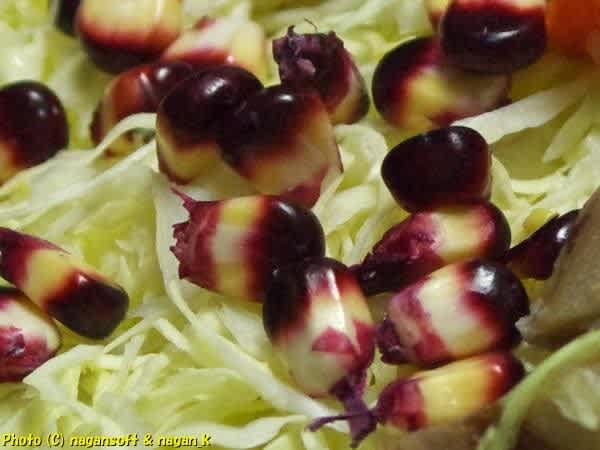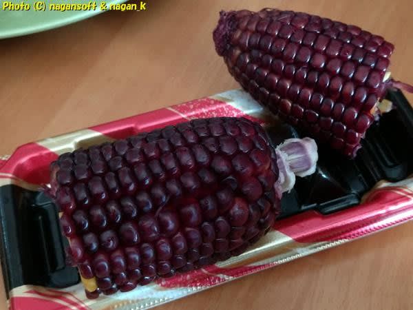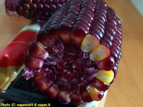 つまり、このトウモロコシは小豆色色素が水に溶けだすのです。食べかすの芯を折ると汁が出るのです。