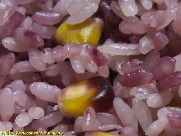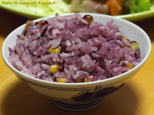 出てきた「小豆色トウモロコシの炊き込みご飯」です。