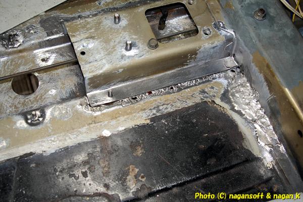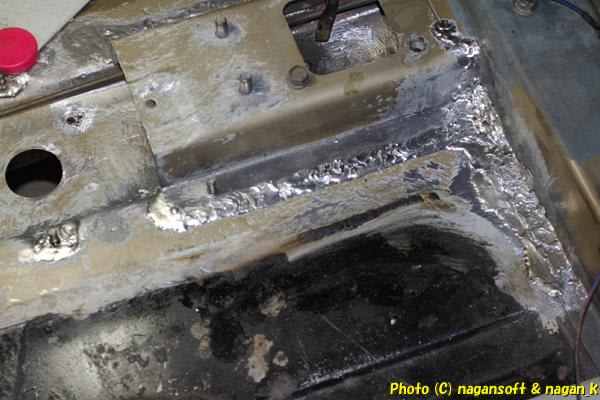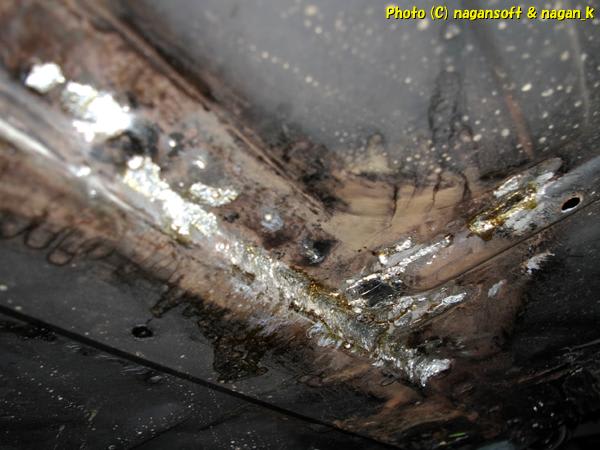 今日で区切りを付けたいので、センタートンネルと梁周辺のサビ穴をしつこくハンダしてふさぎました。