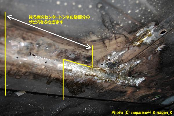 まずは、車体下にもぐって、後ろ席のセンタートンネル袋部分のサビ穴を確認します。
