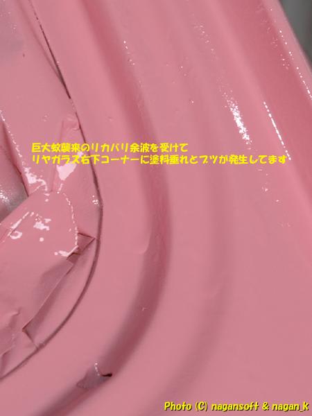 リカバリーでその周辺にガンが集中したので、その余波をくらってリヤガラス右下コーナー周辺に塗装垂れとブツができてます。