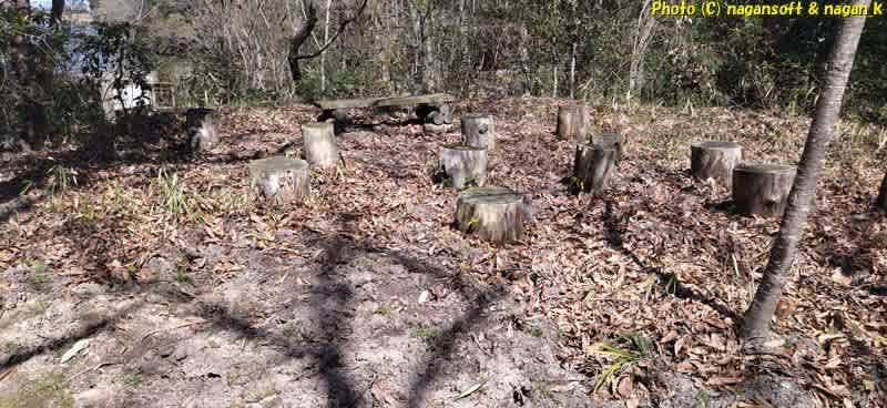 奥にベンチ、手前の切り株も椅子設定の場所と思うところ。