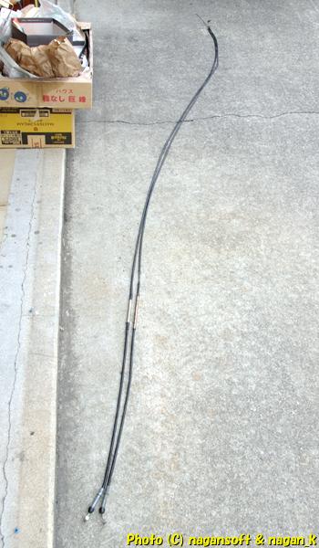 修理中のアクセルワイヤーと、車体についていた切れかけのアクセルワイヤーを、なるだけ真っ直ぐに自然体の状態で添い寝させます。