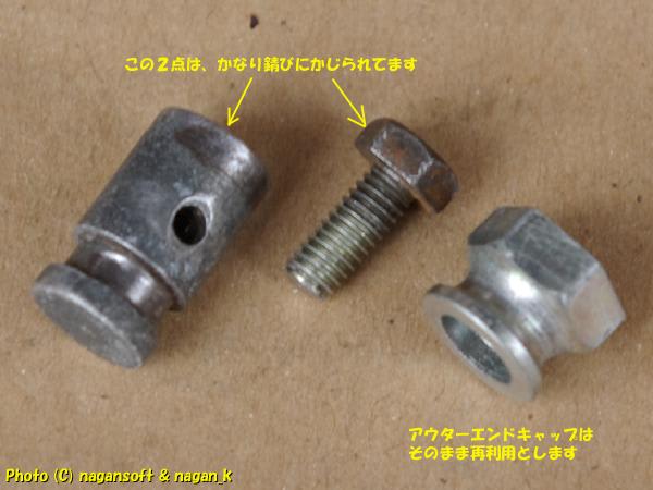 アウターエンドキャップは、車体についていたワイヤーのものはサビサビでダメ。ヤフオク産切れたワイヤーについていたものが綺麗なメッキ肌を保っていました。ついては、ヤフオク産切れたワイヤーについていたものをそのまま再利用します。