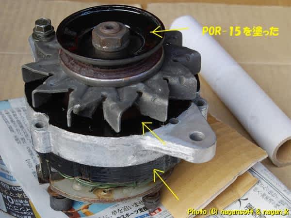 ファンが邪魔で磨くことができなかったボディー部分、紙が巻かれている部分、プーリーの側面にPOR-15を塗りました。