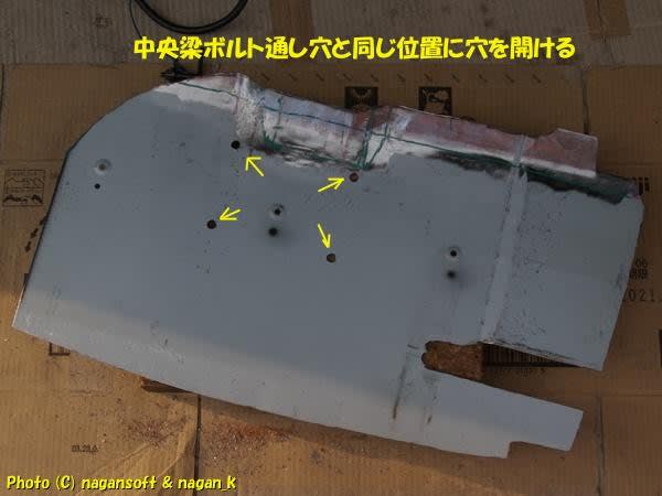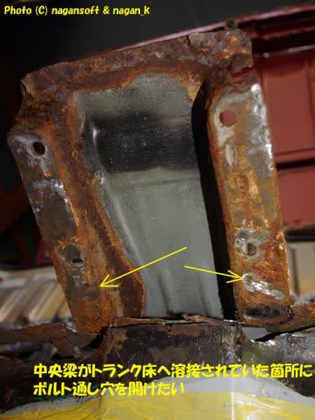 次は中央梁がトランク床とスポット溶接されていた部分に、ボルト通し穴を開けます。