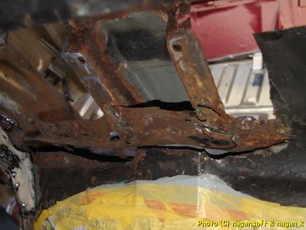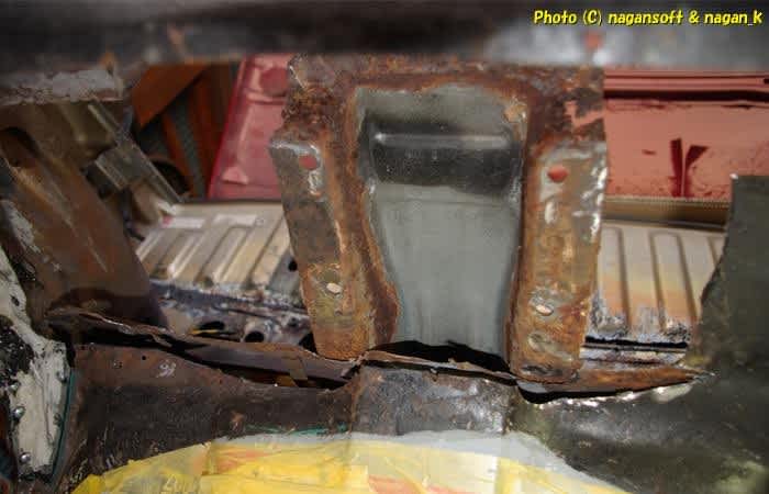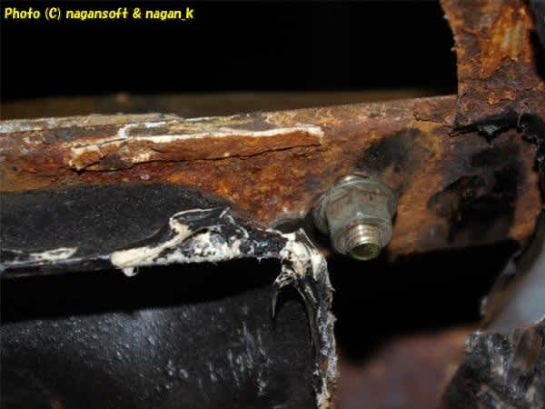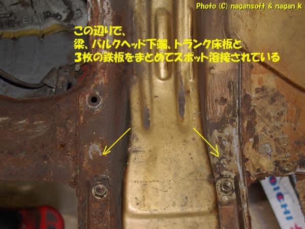 中央梁とバルクヘッド下端とトランク床、つまり3枚の鉄板を貫通してスポット溶接されている箇所があります。