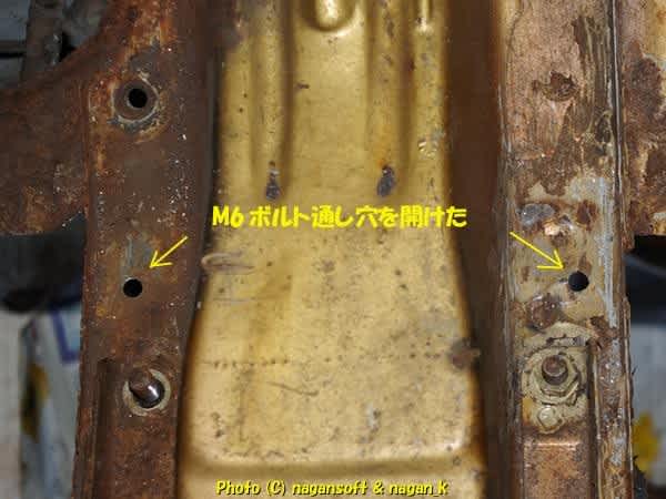 トランク床に中央梁に開いていたボルト通し穴と同じ位置に穴を開けました。