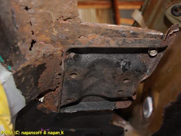 梁の裏側はトランク床を挟んでラックブラケット(ステアリングギアボックスブラケット)を固定しています。そのラックブラケットを仮固定してみます。