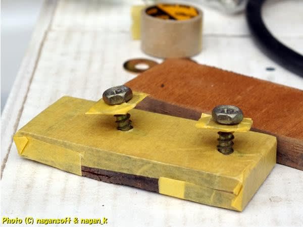 幅4cm長さ10cm程度の木っ端に切り出しまして、ボンド施工するときにボンドが貼り付かないようにマスキングテープ貼り付けます。押さえボルトにも大き目のワッシャーをあてがうのですがワッシャーもマスキングテープ包帯しています。