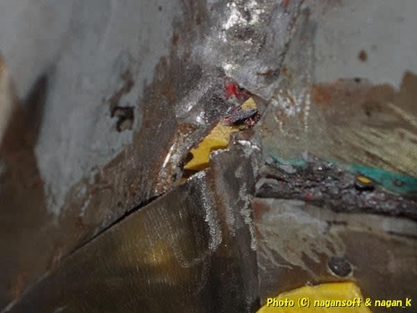 下の端部分、溶接アークでボロボロ切り欠きになっているところにまだ錆があるように見えるけど、もう私の10本の指先では研げないよ。