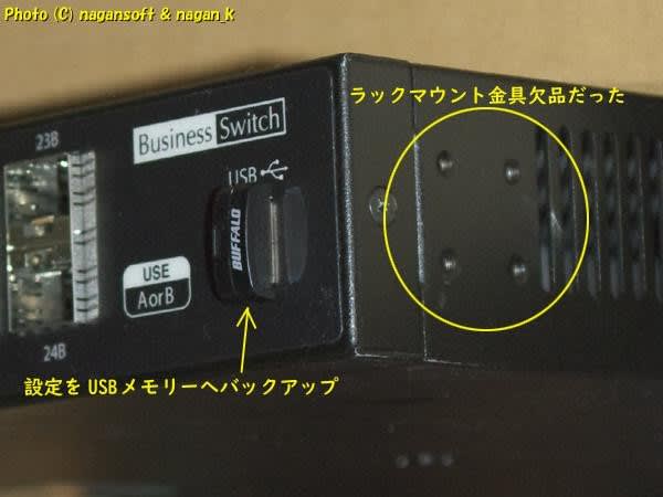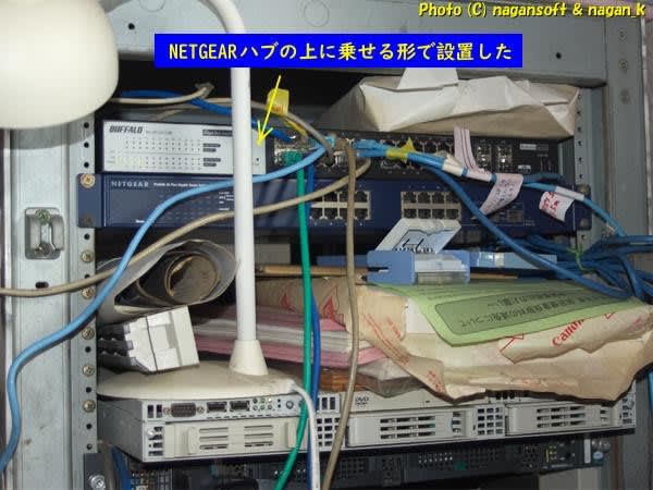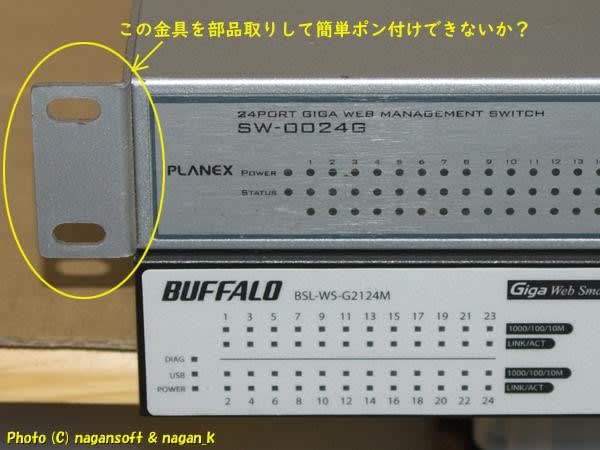 サーバーラックに固定する金具が付いてないのよ。前オーナーは卓上にハブを置いていたのかしらん?