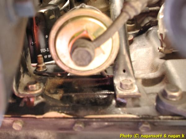 (写真は車体下からオイルカートリッジの方を見上げたところです。目の前の大きいのは燃料フィルターで、その奥に見える狂いやつがオイルカートリッジです)