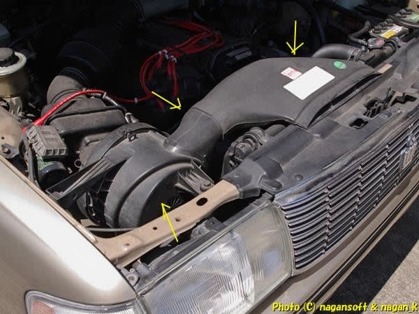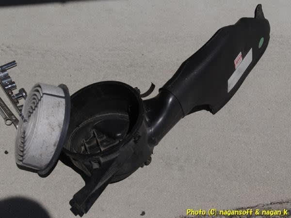エアクリーナーケースカバーから空気取り入れ口までを取り外します。