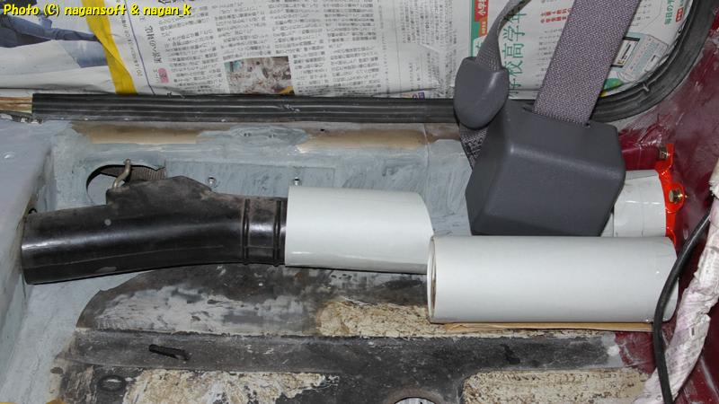 ヒーターホースカバーが巻き取りシートベルトも隠すようにして….