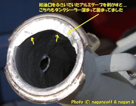 燃料給油口です。アルミテープで封をしてタンクシールをゆりかごしてます。