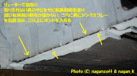 今までに、リューターでチマチマと錆取りし、リューターの刃が届かない部分を錆び転換剤を刷毛塗りし、錆び転換剤の刷毛が届かないさらに奥の部分をめがけてジンクスプレーを吹きこんでいます。