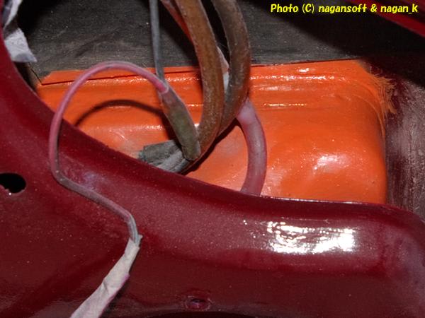 ガソリンタンク鶴頸がくぐる部分は塗膜が頼りない状態でした。というか塗装し忘れしているところへ塗装ミストが乗ってました。プラサフ色が見えるのは不許可なのでPOR-15でタッチアップしました。