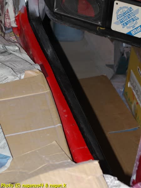 乗降口下側ウェーザーストリップゴム差込リップ部分の室内側です。ウェザーストリップを試行錯誤装着鈑金したときにリップの室内側の塗装にダメージを与えていたのです。