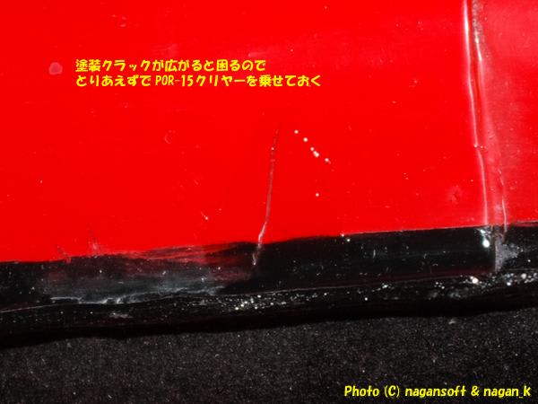 でもね、このままだとクラック箇所から湿気が浸入してさらにトラブルを呼び込んだら嫌なので、POR-15のクリヤーをお手軽に筆塗りしておきました。
