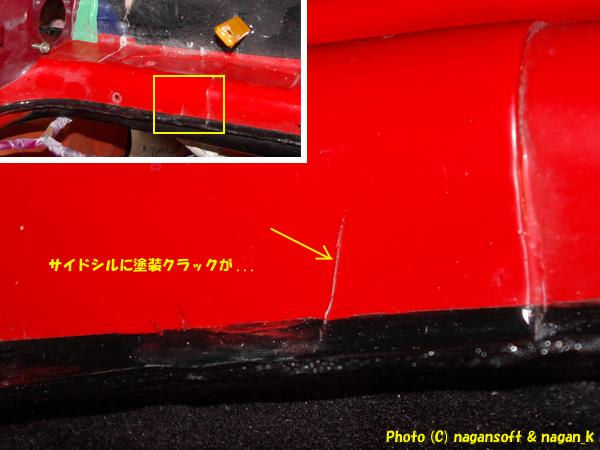 あちゃー、サイドシル室内側アーチ部に塗装クラックを発見です。