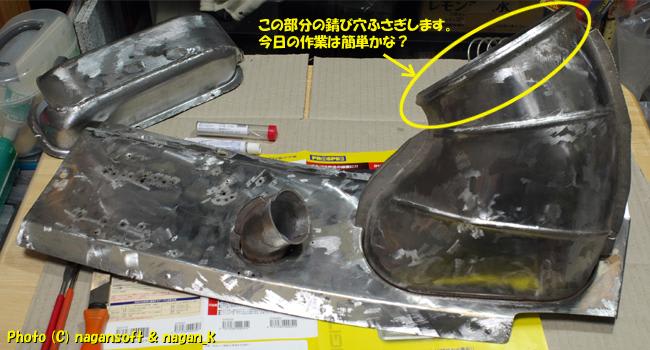 ともかくボロボロとまでいきませんが、小さい針穴のような錆び穴があちこちに、大き目の穴が数か所あります。それをふさいでいきましょう。