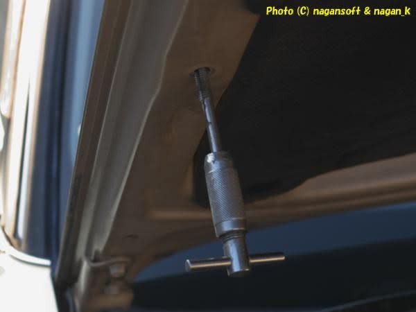 車体に付いているヘタレのボンネットダンパーを取り外しにかかります。