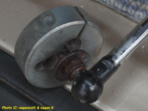 このボルトを外す工具なんだけど、激貧の私が所有する工具では短いスパナしかなくってさぁ。そのスパナの柄の長さだと太刀打ちできません。