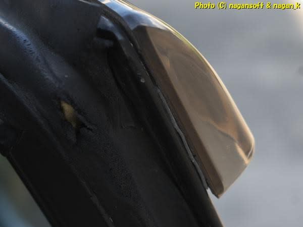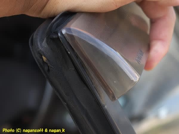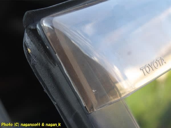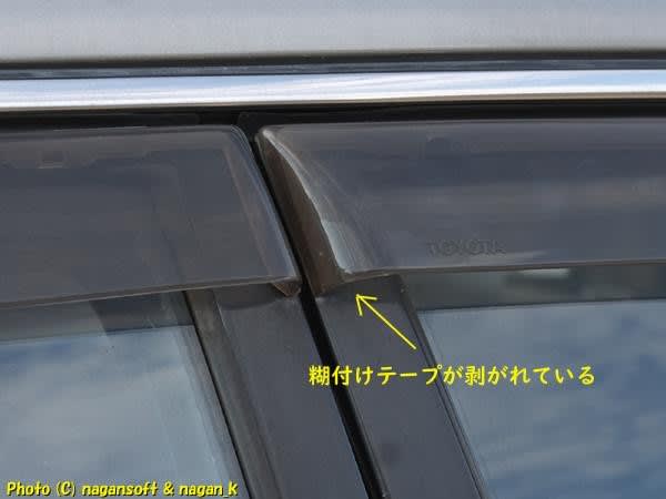 調べたら、運転席側ドアサイドバイザーの後ろ端が貼り付けテープが剥がれてました。