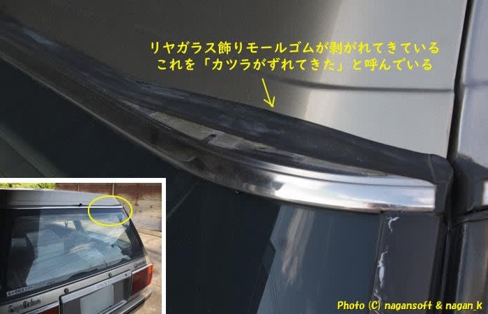 そうそう、暑さのせいなのか…、リヤガラス上モールの飾りゴムが剥がれている。