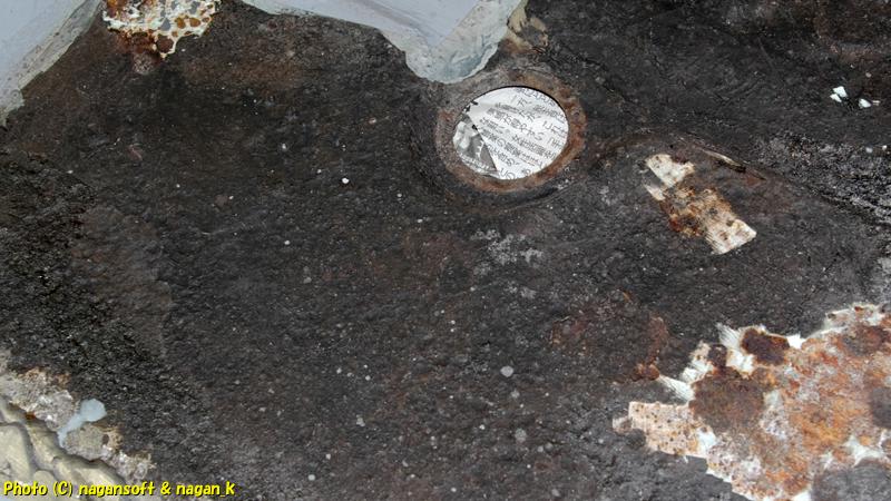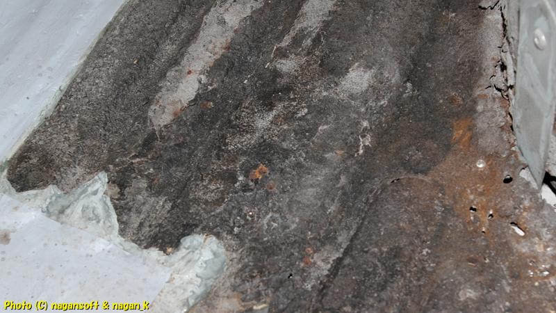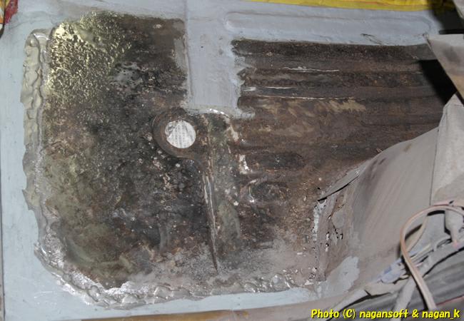 この黒色の物体がなんなのか不明ですが、前オーナーさんがしている仕事なので、きっと錆を取らないで、その上に硬い黒色塗料、その上にタール状の塗料という仕上げだろうと思います。