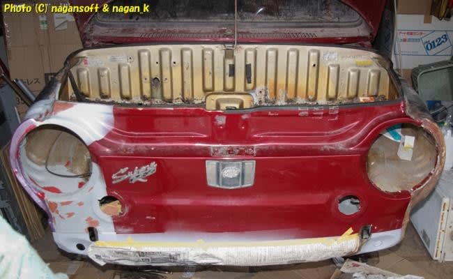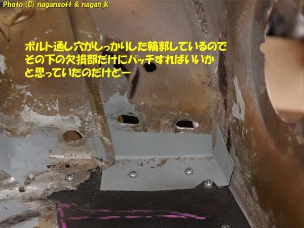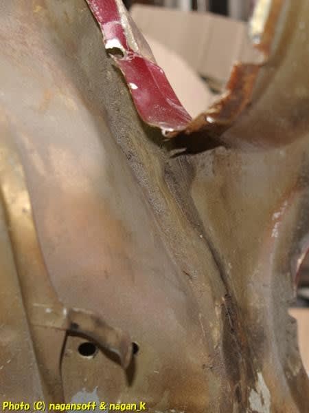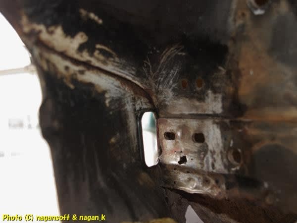 ここに穴が開くとタイヤ巻き上げ水がトランク内部に浸入して、フロントパネルとの合わせ隙間を通り、トランク床角の鉄板合わせへと流れます。