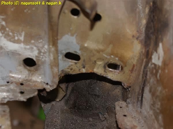 これってタイヤが巻き上げた泥水から泥やら汚れやら体積して水を呼んでスポット溶接部分から錆びて溶け落ちていると思います。