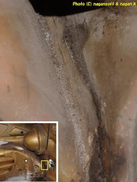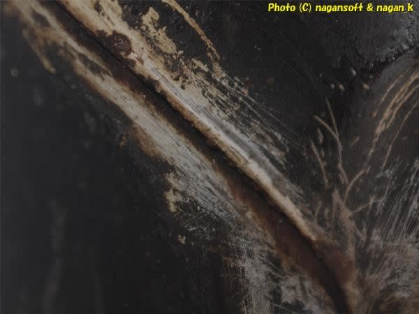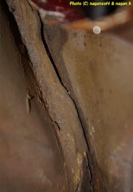 錆穴から水浸入しているのが水跡というか錆筋というか、いやいや赤い錆の砂利道が重力にしたがって伸びてますよ。